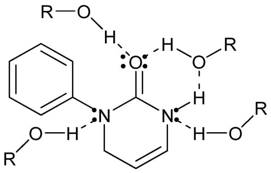 Mechanistically, we postulated that photoexcitation of 4-allyl-tetrazolones 34 leads to elimination of molecular nitrogen, yielding the triplet biradical intermediate 35. In a second step, this intermediate rapidly undergoes ring closure and a 1,2-migration of hydrogen to form the pyrimidinone 36, in an exothermic process. This mechanistic proposal was supported by the effect of the solvent viscosity on the photolysis quantum yields, and the sensitizing effect of the dissolved oxygen upon the photodegradation of tetrazolone, interpreted as a consequence of the T→S conversion of triplet biradicals, opening the way to the formation of the product 36. Both effects were explained by the involvement of a caged triplet radical pair. The photostability exhibited by the pyrimidinones in alcoholic solutions, as opposed to cyclohexane, acetonitrile and carbon tetrachloride, is due to an efficient solvation through strong association with solvent molecules. Pyrimidinones bear several putative atoms capable of forming hydrogen bonds with solvent molecules, as depicted in Figure 3. Product solvation would then be very efficient, through stable ‘cages’ enclosing the pyrimidinone molecules and preventing their photodecomposition. The influence of these cage effects is also related to the kinetic energy of the primary photoproducts and to the viscosity of the solvent, affecting the photolysis quantum yields. In the alcoholic solutions, the pyrimidinones have more difficulty in forming molecular fragments upon excitation due to the ‘solvent cage’, this effect increasing with the increase in alcohol viscosity. Also, the absorbed energy is more efficiently dissipated though the solvated complex. The introduction of substituents on the allylic part (e.g. phenyl in 34c) only affects the time required for complete conversion (around 5 hours for 34c, as opposed to 3 hours for compound 34a). Thus, we consider that the methodology can be applied to a wider range of 4-allyl-1-substituted tetrazolones, allowing for the introduction of chemical diversity. This methodology provides a valid access to a range of 3,4-dihydro-6-substituted-3-phenylpyrimidin-2(1H)-ones that may be stored as stable compounds after isolation.