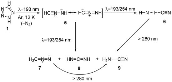 Tetrazoles are also particularly interesting compounds because they exhibit a very rich photochemistry. The photochemistry of matrix-isolated unsubstituted tetrazole was studied by Maier and co-workers and published in 1996 []. Upon photolysis with the 193 nm emission line of an ArF laser, rapid photocleavage of tetrazole was observed, leading to extrusion of N2 and formation of several different photoproducts, including nitrilimine (5), an HCN···NH complex (6), diazomethane (7), carbodiimide (8) and cyanamide (9) (Scheme 1). By use of different excitation wavelengths, cyanamide and carbodiimide could be accumulated as final products. This investigation also revealed, for the first time, the vibrational signature of matrix-isolated nitrilimine [].