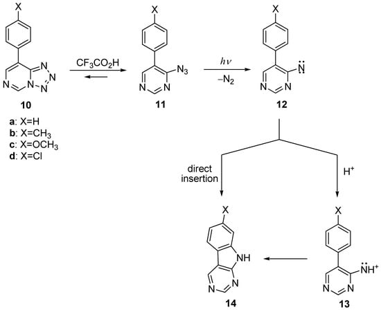 In 1972, Swenton et al. demonstrated that photolysis of biaryltetrazoles 10a-d in acidic media leads to 9H-pyrimido[4,5-b]indoles 14a-d in good to excellent yields (84–95%) ( Scheme 2) []. The authors presented a mechanistic proposal, according to which the reaction involves a shift of the tetrazole-azidoazomethine equilibration in acid media to the azide tautomer and its subsequent photolysis (16 RPR-3000-Å lamp). The initial photochemical reaction involves photoextrusion of molecular nitrogen, producing the corresponding nitrene 12, followed by nitrene insertion to produce 14. However, in the highly acidic trifluoroacetic acid, protonation would result in formation of the nitrenium ion 13, which would be most reasonably followed by cyclization and proton loss to yield 14. The authors demonstrated that substituent effects on the photolysis are negligible for the range of compounds studied, and chemical diversity may therefore be introduced.