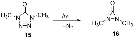 In 1975 Quast and Bieber described the photochemical synthesis of diaziridinone 16 from photolysis of 1,4-dimethyl-1,4-dihydro-5H-tetrazol-5-one (15) (Scheme 3) []. In the course of their investigation, the authors observed that photolysis of the thermally highly stable tetrazolone 15 in ether or 2-propanol afforded only secondary products from radical reactions of primary photoproducts with the solvent. However, when the irradiation of 15 (degassed samples at 10−5 Torr, 150 or 450 W Hg lamp) was conducted in CD3CN a single photoproduct was formed, characterized by 1H-NMR and IR as 1,2-dimethyldiaziridinone (16).
