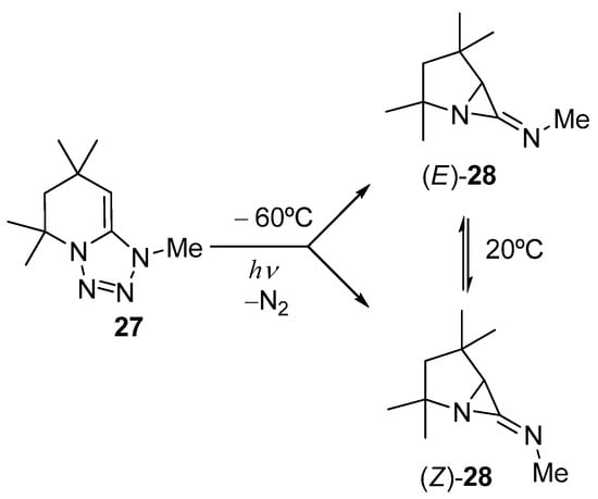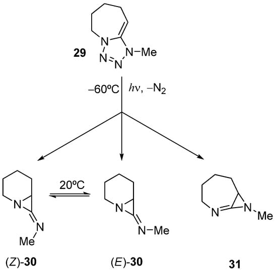 In 1998, Quast and Fuss described the synthesis of different annulated iminoaziridines by photolysis of 5-alkylidene-4,5-dihydro-1H-tetrazoles in solution []. During this study, diluted degassed solutions of alkylidenedihydrotetrazoles 25, 27 and 29 were irradiated (λ ≥ 305 or 320 nm; high pressure mercury lamp) in [D8]toluene, affording annulated-iminoaziridines with an exocyclic CN double bond, i.e. derivatives 26, 28, and 30, respectively (Scheme 7, Scheme 8 and Scheme 9) through extrusion of molecular nitrogen. Also, an equal amount of the isomer 31 with the endocyclic CN double bond is reported from 29. In addition, irradiation (λ ≥ 320 nm) of a solution of alkylidenedihydrotetrazole 32b in [D8]toluene at −60 °C afforded the hexahydronaphthyridine 33 quantitatively (Scheme 10). In a number of experiments, low temperature (−60 °C) was maintained during irradiation and recording of 1H-NMR spectra, precluding thermal (E) ↔ (Z) equilibration of the photoproducts 25, 27 and 29. Declining of the original yellow colour during irradiation indicated the disappearance of the alkylidenedihydrotetrazoles, which occurred slower at −60 °C than at 20 °C. Besides, the photolysis was monitored by NMR spectroscopy, which provided the evidence to the photoproduct structures. Some of the alkylidenedihydrotetrazoles investigated in this work were also irradiated in [D6]benzene and [D6]tetrahydrofuran. In all cases except for 25a, the conversion and the yields, determined by comparison with the internal standard t-butyl methyl ether, were higher than 95%, and no by-products were identified. Just derivative 25a formed considerable amounts of unidentified by-products, and, therefore, the yield of 26a dropped to 30–50% (see Table 1).