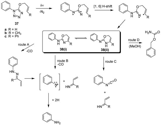 Oxazines 38a-c can adopt two tautomeric forms, depending on the position of the amino function on the molecule. The NH group can act as a bridge, connecting the oxazine and phenyl rings, or this group can be alternatively included in the oxazine ring. DFT calculations performed at the B3LYP/6-31G(d,p) level of theory were carried out for all conformers of the two tautomeric forms of oxazines, 38a and 38b. The results obtained led to the identification of two low-energy local minima when the NH group is connected to the two rings [structure 38(i)], and of three low-energy local minima when the NH function is included in the oxazine ring [structure 38(ii)]. Because of the significant energy differences between the tautomers 38(i) and 38(ii), it can be expected that the population of oxazines at 25 °C will be dominated by structures 38(i). Indeed, for all compounds 38a-c, predicted populations of forms 38(i) exceed 96%. The contribution of the minor tautomer 38(ii) to the equilibrium mixture was predicted to range from about 2 to 4%, for isolated molecules in vacuum. It is important to call attention to the fact that the total dipole moments of tautomers 38(ii) are systematically higher than those of the tautomers 38(i). Thus, it may be expected that, in polar media, forms 38(ii) will undergo additional stabilization with respect to forms 38(i), and the relative population of the minor conformer will increase. Thus, both the tautomers 38(i) and 38(ii) are relevant for further photolysis of oxazines 38a-c in solution, and the secondary photoproducts of 5-allyloxy-tetrazoles 37a-c will be formed via photodecomposition of forms 38(i) and 38(ii), as presented in Scheme 12.