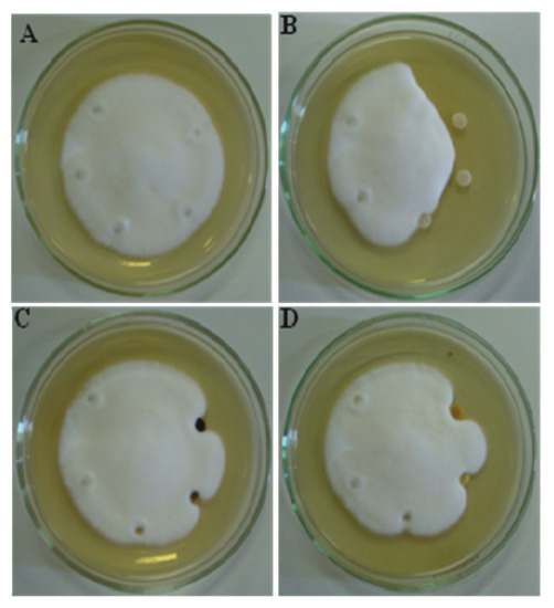 Petri-plates containing 20 mL de SDA medium were seeded with 10 µL of standard spore suspension (105 spores/mL). The plates were incubated in a humidified chamber at a temperature of 28 °C until the diameter growth mycelial growth 2–3 cm. After, the disks were placed at a distance of 0.5 cm from the edge of the colony. About 10 µL of serial dilutions of dichloromethane extract, chloroform fraction, DMSO, and water were added to the disks. The plates were incubated at a temperature of 28 °C until final growth. The inhibition of hyphal elongation was observed by the lack of growth around the disk containing the drug test [18].
