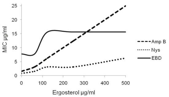 Many different modes of action can be studied, for example, the biosynthesis of ergosterol or the interference of drug-ergosterol binding with cell functions. Ergosterol is lipid that forms part of the membranes of fungi and protozoa. For example amphotericin B binds to ergosterol perturbing membrane functions and causing leakage of cell contents [19]. Figure 2 shows the effect of exogenous ergosterol on the MIC of the drugs.
