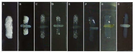 Antifungal activity of nail lacquer with different concentrations of extract against T. rubrum. A = Control; B = Nail lacquer without fraction; Nail lacquer with fraction: C = 2.5 mg/mL; D = 5 mg/mL; E = 10 mg/mL; F = 20 mg/mL; G = 40 mg/mL; H = Micolamin.
