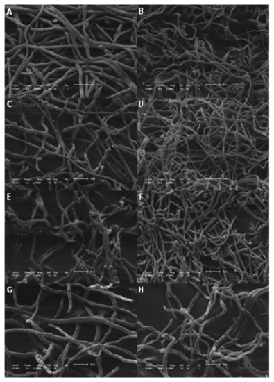 Scanning electronic microscopy of Trichophyton rubrum treated with different concentrations of fraction in nail laquer. A and B = control; C and D = nail lacquer without fraction; E and F = nail lacquer with 1.25 mg of chloroform fraction; G and H= nail lacquer with 5 mg of chloroform fraction. C, E and G= samples taken near the nail lacquer; D, F and H=samples taken far the nail lacquer. Magnification: 3000× (A) and 2000× (B–H). Bars 5 µm.
