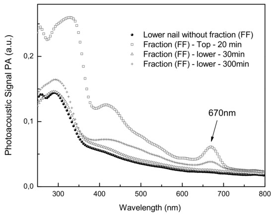 The human nail is susceptible to a large number of fungal (onychomycosis) and other infections [21]. The photoacoustic spectroscopy technique if used to measure the thermal diffusivity (α) of human nails [21]. Figure 5 shows the spectra of the drugs on the nail. The medicine was placed on top of the nail and a top spectrum was obtained soon after. The graphic shows the curve of the absorption spectrum of the bottom of the nail 30 min after application of FF fraction. After 5 h of application of the product, could be performing the spectrum observed in the inner part of the permeation of the nail. The band around 670 nm becomes visible, showing the permeation. The nail lacquer containing the FF fraction showed good penetration in the nail and the absorption is still equal after extending the time. Nuglisch et al. [22] verified that using two formulations contained cyclopirox the propagation rate through the nails in different samples from healthy volunteers showed that the photoacoustic spectroscopy technique is a useful tool to analyze the penetration of topical formulations in human nails.