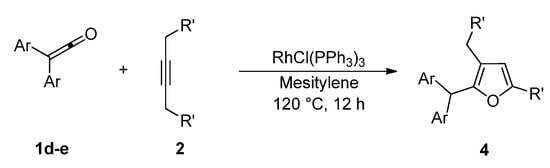- Mitsudo, T.; Kadokura, M.; Watanabe, Y. Palladium complex catalyzed reaction of diphenylketene with terminal acetylenes giving disubstituted acetylenes. Tetrahedron Lett. 1985, 26, 3697–3698. [Google Scholar] [CrossRef]