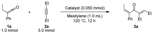 | a Ketene (1.0 mmol), alkyne (3.0 mmol), RhCl(PPh3)3 (0.050 mmol), and mesitylene (1.0 mL) at 120 ºC for 12 h under an argon atmosphere; b GLC yield. | |||||||