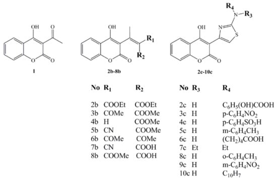 - Vuković, N.; Sukdolak, S.; Solujić, S.; Milošević, T. Synthesis and antimicrobial evaluation of some novel 2-aminothiayole derivatives of 4-hydroxy-chromene-2-one. Arch. Pharm. Chem. Life Sci. 2008, 341, 491–496. [Google Scholar] [CrossRef] [PubMed]