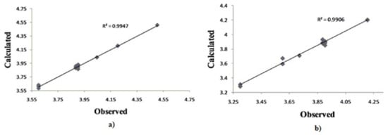 The 4-OH and S functional groups do not take the same part in antibacterial activity of 9c in model 2, with correlation factors between biological activity and charge r4-OH = 0.603 and rS= 0.942. The LUMO energy factor suggests that charge transfer might be involved in the mechanism of action []. As mentioned, the main factor in the activity is the N-thiazole atom, with a correlation r = 0.674 of charge and antimicrobial activity of 9c. Both QSAR equations (1) and (2) for activity against S. aureus and E. coli are statistically very significant with F=104.2987, r (99.7%) [Figure 1 (a)] and F=28.8394, r (99,5%) [Figure 1 (b)], respectively.