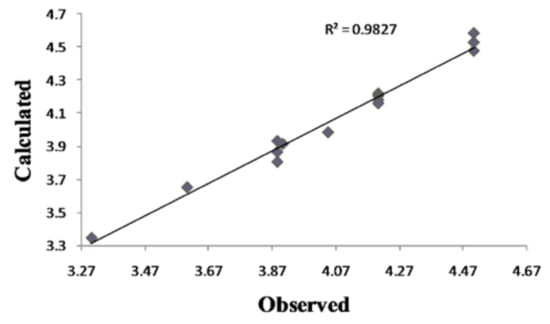 Plot of calculated vs. observed – log MIC values of the training set compounds obtained from Equation (3).