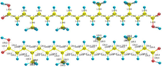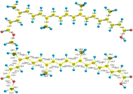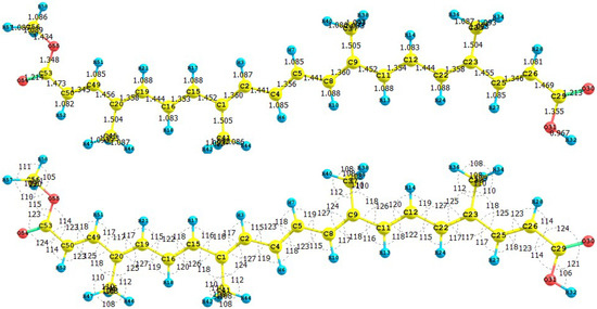 The apocarotenoids bixin (or cis-bixin), norbixin and transbixin have also been recently tested as photosensitizers for DSSC [39]. The results for the equilibrium conformations of the neutral molecules of bixin, norbixin and transbixin calculated at the M05-2X/6-31+G(d,p) level of theory are presented through a representation of the molecular structure of the molecule showing the interatomic bond lengths and bond angles in Figure 3, Figure 4 and Figure 5.