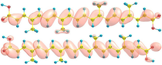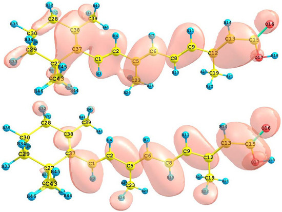 The HOMO and LUMO of the retinoic acid molecule calculated with the M05-2X/6-31+G(d,p) level of theory are displayed in Figure 10. This can give us an idea of the reactivity of the molecule. The sites for electrophilic attack will be those atoms bearing a negative charge and where the Fukui function fk- is a maximum. These values as well as the results from the condensed dual descriptor confirm that the site for the electrophilic attack is the C12 atom. The site for potential nucleophilic attack would depend on the values of fk+ on the atoms with a positive charge density and where the condensed dual descriptor has the largest positive value. The calculated results show that the site for nucleophilic attack will be the C38 atom.