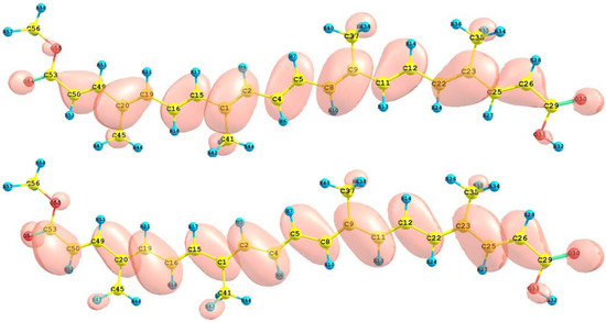 The HOMO and LUMO orbital of the bixin, norbixin and transbixin molecules calculated with the M05-2X/6-31+G(d,p) level of theory are displayed in Figure 6, Figure 7 and Figure 8. The sites for electrophilic attack will be those atoms bearing a negative charge and where the Fukui function fk- is a maximum, while the sites for potential nucleophilic attack would depend on the values of fk+ on the atoms with a positive charge density. The calculated results are shown in Table 6.