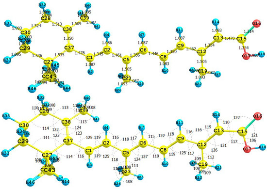 Retinol, also known as vitamin A, is essential for life. Retinol in the human body is produced by a series of metabolic processes that begin with dietary intake of β-carotene and retinyl esters. Retinoic acid (RA), the oxidized form of Vitamin A, is one of the most potent physiological metabolites of retinol. Retinoic acid has also been tried as a sensitizer for DSSC [40]. The results for the equilibrium conformation of the neutral molecule of retinoic acid calculated with the M05-2X/6-31+G(d,p) level of theory through a representation of the molecular structure of the molecule showing the interatomic bond lengths and bond angles are presented in Figure 9.