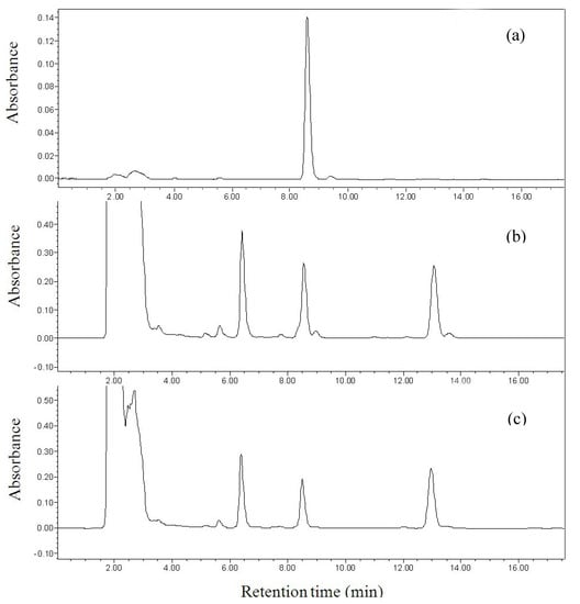 Chromatograms of standard linalool and the extracts of Michelia alba: (a) standard linalool, (b) extract of white flower, and (c) extract of tender leaves.