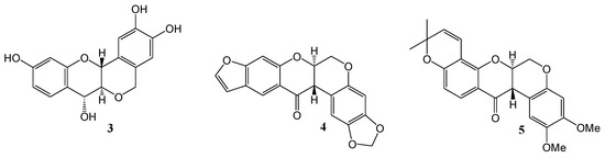 - Suginome, H.; Yomezawa, T.; Masamune, T. Photoinduced Oxygenation of Dehydrorotenones. Tetrahedron Lett. 1968, 49, 5079–5082. [Google Scholar]