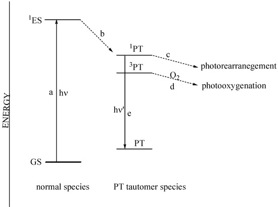 Proposed flavonol excited states: (GS ground state (singlet), 1ES excited state (singlet), PT ground state of phototautomer (singlet), its singlet excited state (1PT) and triplet excited state (3PT) a = light absorbtion; b = intersystem crossing; c and d = photochemical reaction; e = light energy emission).