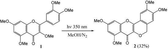 Waiss and Corse (1965) [31] investigated per-O-methylflavonols. Photoxidative cyclisation of quercetin penta-O-methyl ether (1) afforded the tetra-O-methyl ether of β-photomethylquercetin (2) in 32% yield in deoxygenated methanol under dry nitrogen (low pressure mercury lamps, 350 nm) (Scheme 1). This result led the authors to speculate that photochemistry was involved in the biosynthesis of peltogynol (3) and the rotenoids [e.g., dolichone (4) and α-toxicarol (5) (Figure 1], which co-occur with 2-methoxyisoflavonoids.