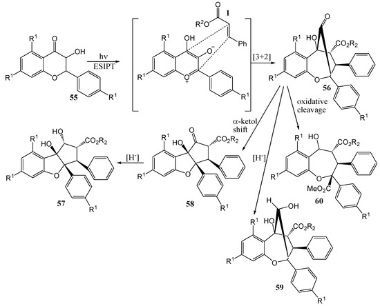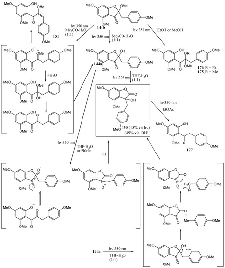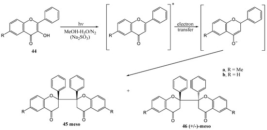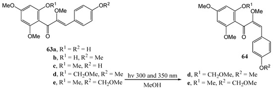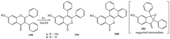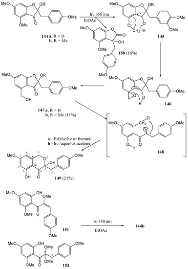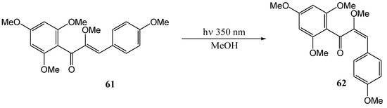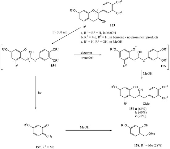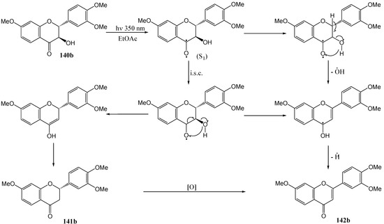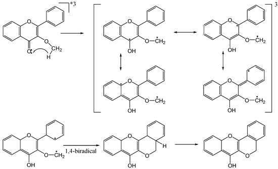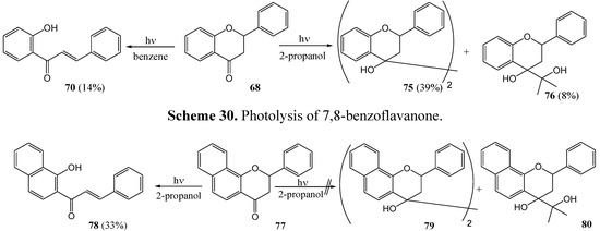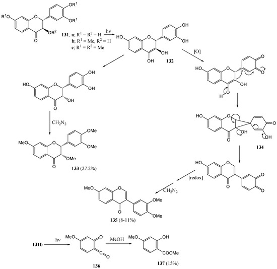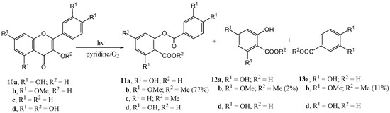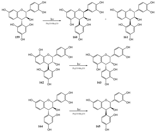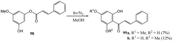 Much of the older photochemistry work in flavonoid chemistry was on compounds with unsubstituted aromatic rings and high yields were reported (see the review by Gupta et al. [28]). Polyphenolic flavonoids are more representative of naturally occurring molecules and have more interesting biological properties. These compounds generally afford lower yields and require special conditions to react due to deactivation by phenolic hydroxy and methoxy groups [29].