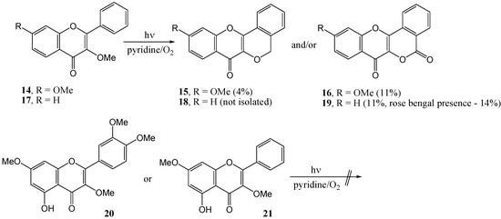 Matsuura and Matsushima [35] postulated that, despite rigorous efforts by Waiss and co-workers [31,32] to work under oxygen-free conditions, oxygen must be involved in the transformation of intermediary lumimethylquercetin to photomethylquercetin. Photolysis of 3,7-dimethoxyflavone (14) under oxygen in pyridine (high-pressure mercury lamp with a Pyrex filter) yielded at least seven compounds. Only the photomethyl analogue (15, 4%) and the lactone (16, 11%) were isolated. 3-Methoxyflavanone (17) yielded only the lactone (19, also 11%) (Scheme 5).