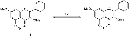 The mechanism of the formation of the lactone is given in Scheme 6. Quercetin 3,7,3',4'-tetra-O-methyl ether (20) and 5-hydro-3,7-dimethoxyflavone (21) did not undergo photocyclisation and were recovered unchanged. This was attributed to hydrogen bonding between the 4-carbonyl and 5-hydroxyl group that interferes with the n,π* excitation of the carbonyl chromophore. This conclusion is supported by the fact that o‑hydroxybenzophenone does not undergo photoreduction and is used as a photostabiliser (Scheme 7).