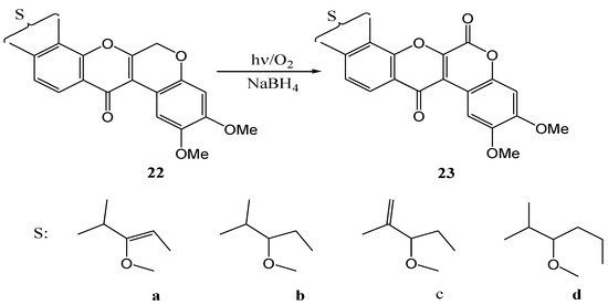 Suginome and co-workers [36] studied photo-oxygenation of dehydrorotenoids. Irradiation of dehydrorotenone (22c) with a 150 W high-pressure mercury lamp in a dioxane-ethanol mixture containing sodium borohydride yielded rotenonone (23c, 40%) (Scheme 8). In the absence of sodium borohydride no isolable product was formed. It was postulated that sodium borohydride converted intermediary hydroperoxides (the product of singlet oxygen attack on the methylene moiety) into hemiacetals that converted to the lactone carbonyl in the product. Sodium borohydride may also destroy free radical initiators and prevent unwanted side reactions. Table 1 gives yields obtained with analogues of dehydrorotenones 23a-d. Rotenone and isorotenone were inert under the reaction conditions.