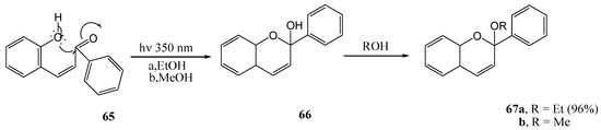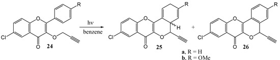 Thakur and co-workers [37] investigated the photochemistry of 3-O-propargylflavonol (24). Irradiation with Pyrex filtered light from a 125 W Hg lamp in dry benzene furnished cyclized products 25a (20%), 25b (16%), 26a (35%) and 26b (30%), as shown in Scheme 9.
