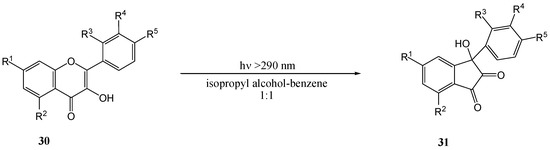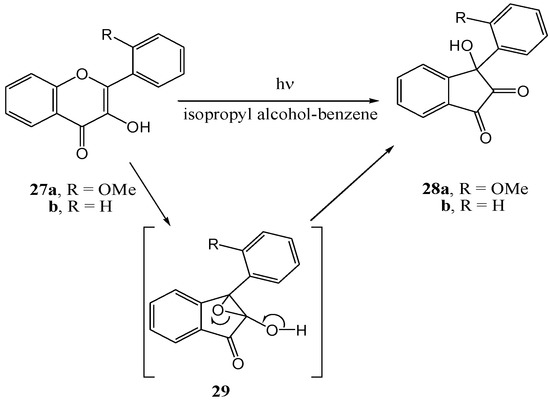 Matsuura and co-workers [38] irradiated flavonol 27b in isopropyl alcohol-benzene with a high pressure mercury lamp through Pyrex and obtained 3-aryl-3-hydroxy-1,2-inandione (28b) in almost quantitative yield. Irradiation of 2'-methoxyflavonol 27a yielded 28a. A 2,3-epoxy-2-hydroxy-1-inandone intermediate 29, formed via a formal [σ2 + π2] cycloaddition, was postulated (Scheme 11).
