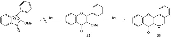 Subsequently Matsuura and co-workers [39] expanded the range of photolysed flavonols (Scheme 12). Table 2 includes previous results of Matsuura et al. [38] and the yields. Free phenolic quercetin (30e) resisted photo-transformation. This could be due to tautomerisation at the 4-CO and 5-OH (cf. photo-enolisation of o-hydroxyacetophenone [40,41]), internal quenching via the hydrogen bond between 4-CO and 5-OH, or deprotonation from the excited state (cf. resistance of 3-hydroxy-benzophenone to photoreduction [42]). Irradiation of the 3-O-methoxyflavonol 32 yielded a tetracyclic product 33. The replacement of the 3-OH group (i.e. 30) with a 3-OMe group (compound 32) prevents the rearrangement to an inandione (compound 31) (Scheme 13).