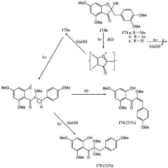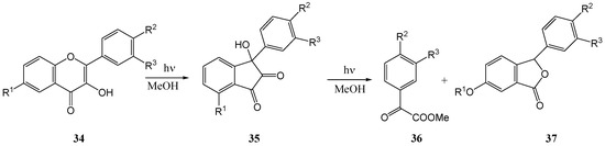Yokoe and co-workers [43] irradiated flavonol 34a in methanol with a high-pressure mercury lamp and obtained, in addition to the 3-aryl-3-hydroxy-1,2-inandione (35a, 8%) [38], a phthalide 37a (0.7%) (Scheme 14).
