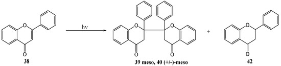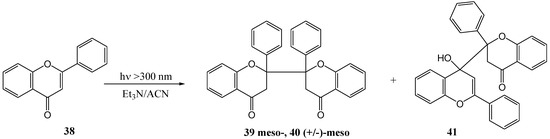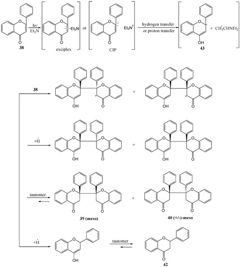 Chen and co-workers [45] investigated the photoinduced electron transfer reactions of flavones with amines. Irradiation of flavone 38 with 0.1 M triethylamine in acetonitrile under argon at >300 nm yielded meso-2,2'-biflavanone 39, (±)-meso-2,2'-biflavanone 40 and flavone [I-4,II-2]-flavanol 41 (Scheme 17). Different amines were used (TEA, DMBA, DMAE, DMA) in acetonitrile and benzene to afford yields, based on consumed flavone 38, as shown in Table 4. These products resulted from radical addition of 4-ketyl 43 and/or its isomeric 1,2-ketyl anion to flavones, respectively (Scheme 19). Single electron transfer (SET) [46] is a well-known photoreaction between amines and α,β-unsaturated carbonyl compounds. The amine donates an electron to form an exciplex or a contact ion radical pair [47] (CIP) that undergoes hydrogen transfer to yield the radical responsible for dimerisation.