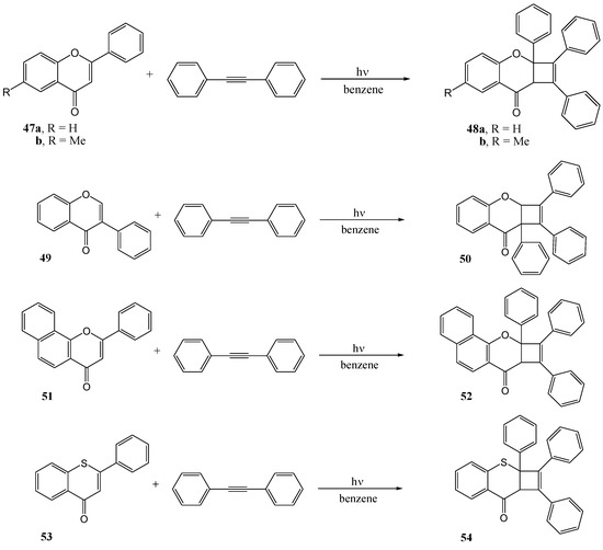 - Schönberg, A.; Khandelwal, G.D. 1,2-Cycloadditionen von Diphenylacetylen an Flavone. Chem. Ber. 1970, 103, 2780–2863. [Google Scholar]
