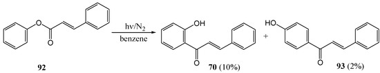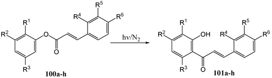 - Obara, H.; Takahashi, H. The Photochemical Fries Rearrangement of Phenyl Cinnamate. Bull. Chem. Soc. Jpn. 1967, 40, 1012–1012. [Google Scholar] [CrossRef]