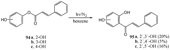 - Ramakrishnan, V.T.; Kagan, J. The Photochemical Synthesis of 2´-Hydroxychalcones from Phenyl Cinnamates. J. Org. Chem. 1970, 35, 2901–2904. [Google Scholar] [CrossRef]