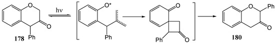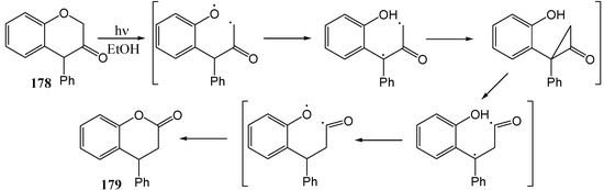 - Padwa, A.; Au, A.; Lee, G.A.; Owens, W. Carbonyl Group Photochemistry via the Enol Form. Photoisomerization of 4-Substituted 3-Chromanones. J. Am. Chem. Soc. 1976, 98, 3555–3564. [Google Scholar] [CrossRef]