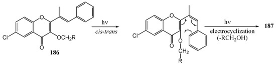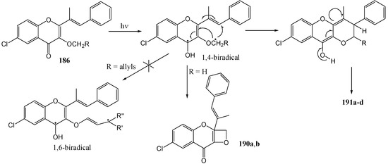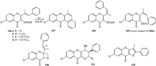 - Kamboj, R.C.; Berar, S.; Berar, U.; Thakur, M.; Gupta, S.C. Phototransformations of some 3-Alkoxy-6-chloro-2-{(E)-1´-methyl-2´-phenylvinyl}chromones: A study of Type-II and Triene Bichromophoric System. J. Photochem. Photobiol. A: Chem. 2009, 204, 122–128. [Google Scholar] [CrossRef]