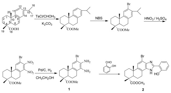 3.2. Preparation of Methyl 2′-hydroxyphenyl-12-bromo-13,14-imidazolyl-deisopropyldehydroabietate (2).