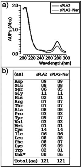 Chemical treatment of purified sPLA2 with naringin was conducted as described by Iglesias et al. []. Under these conditions, a discrete decrease in the absorbance of sPLA2-Nar in the wavelength region between 270–285 nm (Figure 1a) was observed, which can be attributed to the spectroscopic absorption of the aromatic amino acid residues. Amino acid analysis indicated that naringin mainly induced modification on the aromatic amino acid residues and histidines, similar to what was reported in a previous study with morin []. However, we observed slight changes in serine composition (Figure 1b).