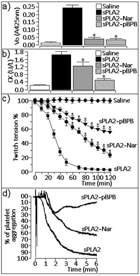 In addition to the enhanced decrease in catalytic activity, sPLA2 inhibitors recognize pharmacological sites of such enzymes, consequently affecting their pharmacological action []. As our studies showed, chemical treatment of sPLA2 with naringin reduced some pharmacological effects, including myotoxicity (Figure 2b), neurotoxicity (Figure 2c), pro-platelet aggregation activity (Figure 2d), and edema formation (Figure 3a), which were induced by native sPLA2 in comparison with the same assays performed with the inhibitor p-BPB.