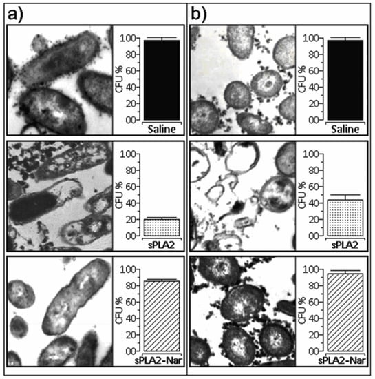 (a) Effect of naringin on the sPLA2 antibacterial activity against Staphylococcus mutans. b) Observed structural modifications induced by sPLA2 and sPLA2-Nar on Xanthomonas axonopodis pv passiflorae. Saline was used as a control. CFU: Colony Forming Units.