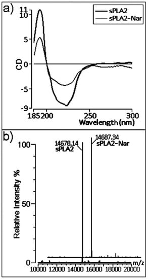 Mass spectrometry showed that sPLA2 had an increase in its mass-to-charge ratio after naringin treatment in comparison with native sPLA2 (Figure 5b). Similar to the alterations observed in the CD spectra, the increase in the molecular mass of sPLA2 is a consequence of the chemical modification induced by naringin.