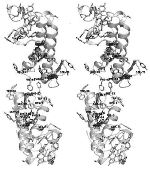 We also verified that treatment with naringin induced conformational changes in sPLA2 with a clear bending of the dimer. Although unsuccessful, several attempts to model this bent dimer were performed, employing rigid body modeling and flexible docking. However, the interpretation of the SAXS model based on the C. d. cascavella homology model superimposed on the agkistrodotoxin crystallographic “dimer” (PDBID: 1BJJ, chains A and E) enabled identification of the aromatic amino acids, histidine and serine, of C. d. cascavella that are present at the dimer interface (Figure 8). These interfacial residues correspond to those affected by the action of naringin, and thus, the chemical modification caused by naringin must be responsible for the conformational change observed in the dimer configuration after naringin treatment.