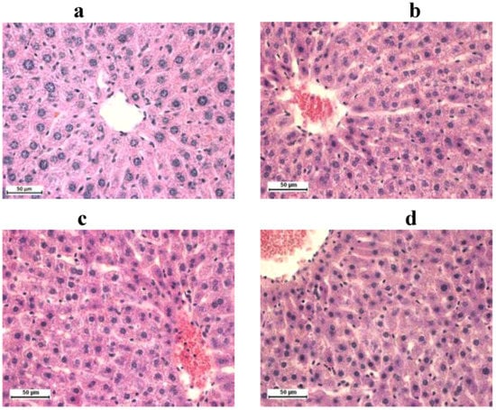Rat liver stained with H&E technique, 400× magnification: (a) control groups; (b) group treated with silymarin; (c) doxorubicin; (d) and combination of doxorubicin and silymarin.