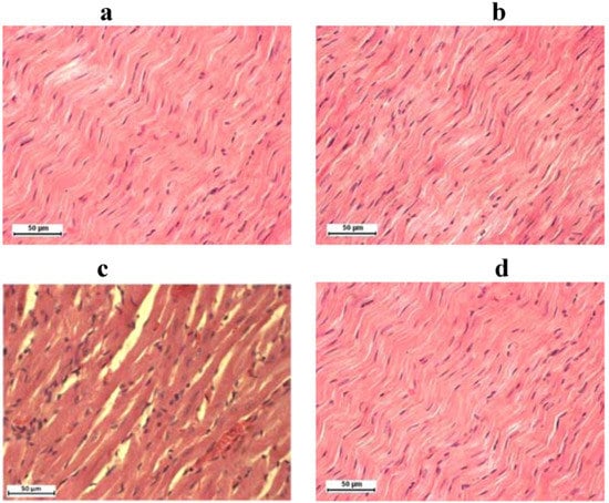 Rat heart stained with H&E technique, 400× magnification: (a) control groups, (b) group treated with silymarin, (c) doxorubicin, (d) and combination of doxorubicin and silymarin.
