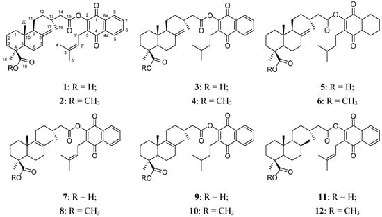 Twelve esters combining a diterpene and lapachol or its derivatives were prepared in moderate to good yields starting from the diterpene diacids I, II or III. The quinone moieties used included 2-hydroxy-3-(3-methyl-2-butenyl)-[1,4]-naphthoquinone (lapachol) (IV), 2-hydroxy-3-(3-methyl-butyl)-[1,4]-naphthoquinone (V) (dihydroprenyllapachol) and 2-hydroxy-3-(3-methyl-butyl)-5,6,7,8-tetrahydro-[1,4]-naphthoquinone (VI) (dihydroprenyl-5,6,7,8-tetrahydrolapachol) (Scheme 2). All the products were characterized by spectroscopic means. Compounds 1–12 (Figure 1) are described for the first time.