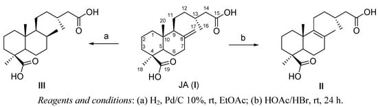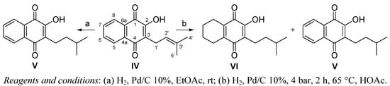 The diterpene junicedric acid (I) (Scheme 1) was obtained by saponification and oxidation of a mixture of labdane diterpenes from Araucaria araucana [9,10]. Isomerization of the double bond of I to II was carried out by treating I in acetic acid (HOAc) with HBr. Reduction of the double bond of I was carried out by catalytic hydrogenation of the terpene (Scheme 1). Lapachol (2-hydroxy-3-(3-methyl-2-butenyl)-[1,4]-naphthoquinone) (IV, Scheme 2) was obtained from “lapacho” wood extract [13]. The hydrogenated products were obtained treating lapachol in ethyl acetate (EtOAc) with palladium on activated carbon (Pd/C) (Scheme 2).