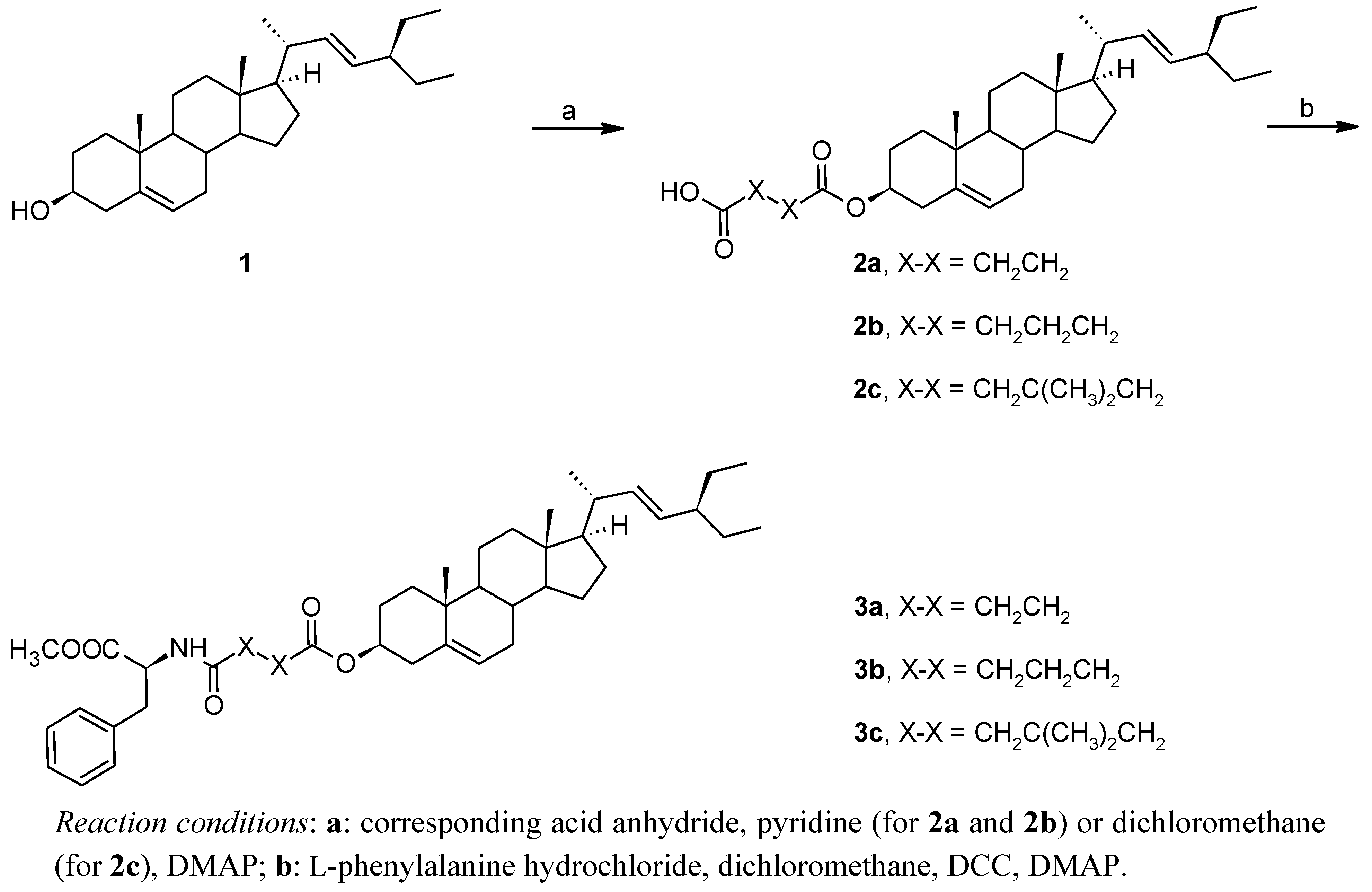 3.3. Methyl N-{4-oxo-4-[(3β,22E)-stigmasta-5,22-dien-3-yloxy]butanoyl}-L-phenylalanine (3a), Methyl N-{5-oxo-5-[(3β,22E)-stigmasta-5,22-dien-3-yloxy]pentanoyl}-L-phenylalanine (3b) and Methyl N-{5-oxo-5-[(3β,22E)-stigmasta-5,22-dien-3-yloxy]-3,3-dimethylpentanoyl}-L-phenylalanine (3c)