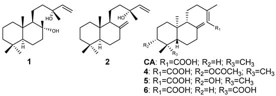 Chemical structures of the evaluated compounds. 1: sclareol, 2: manool, CA: (−)-copalic acid (CA), 4: (−)-acetoxycopalic acid, 5: (−)-hydroxycopalic acid, 6: (−)-agathic acid.